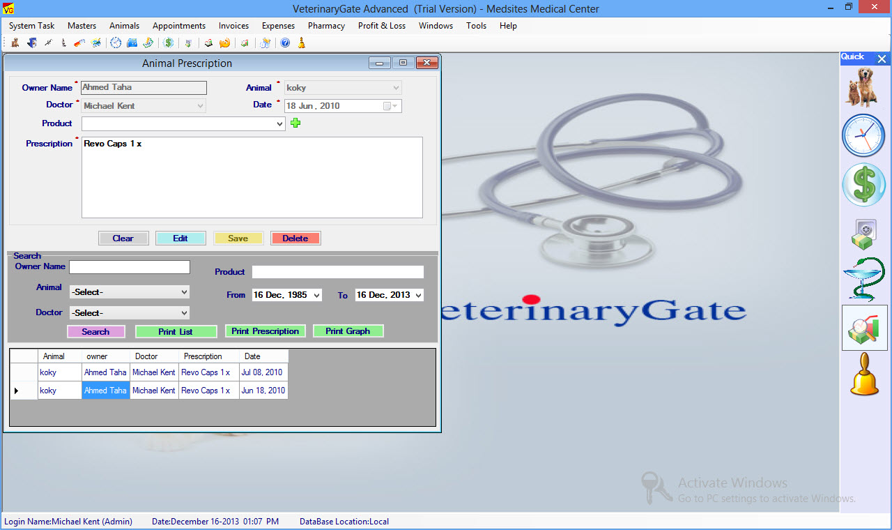 VeterinaryGate is a Veterinary Software, Veterinary Office Billing Software, Practice Management Software offers an easy to use Windows interface featuring an integration of Animal & Pet Medical Records, Appointment Scheduling, Billing, Tracking Receivables, Managing Expenses and Generating Customized Reports And Graphic Reports.